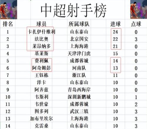 射手榜方面,卡扎伊什维利24球领跑,法比奥2球之差位列第2,莱昂纳多则是21球排在第3。费利佩昨晚关键战无力破门,14球排在第5。泽卡,韦世豪,克雷桑,卡多索,加布里埃尔等人10球刚好挤入前十。