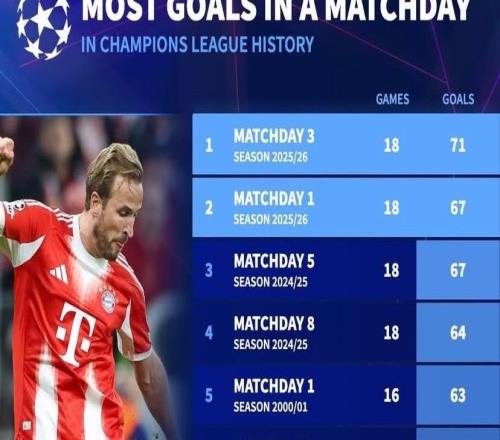 欧冠历史单轮进球数前10:本赛季第3轮71球第1,第1轮67球第2 -